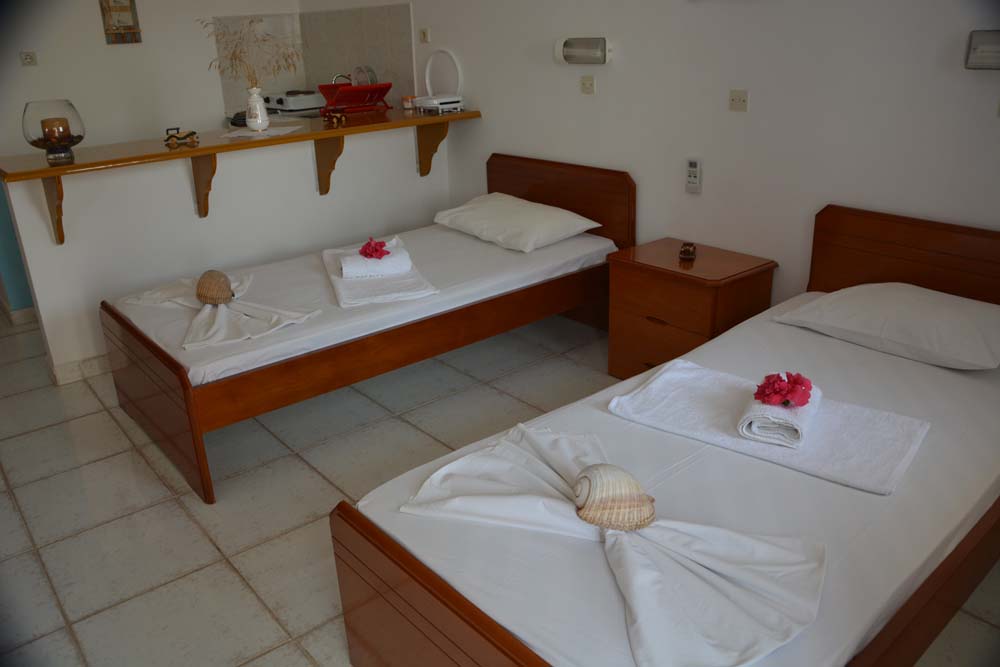 Poseidon studios are made with a will, according to the Aegean Sea colours which dominate the island of Astypalea. Each studio has a different space, in which 2-3 and 4 people can live in double or single beds likewise. The studios are spacious, whereas the four-beded rooms have seperate bedrooms.