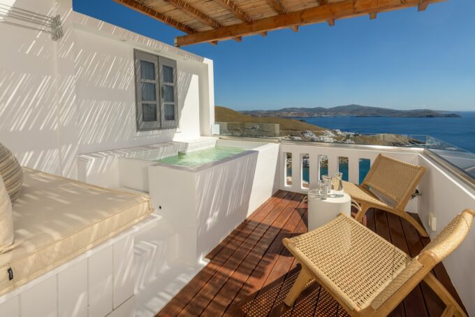 Each of our suites is made in such a way to create an ideal environment where our guests can stay, rest and enjoy. The advantages of the suites include a heated individual jacuzzi as well as the terrace on the side of Chora.
